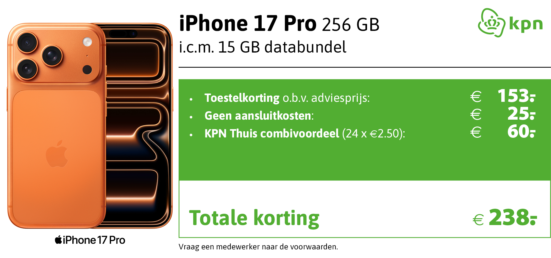 De aanbiedingen van KPN gelden zowel op het mobiele abonnement, als op de onderstaande toestellen. Je bent dus maandelijks goedkoper uit vanwege de korting op het abonnement en krijg je korting op het toestel. Extra voordelig dus. Hieronder hebben we de kortingen voor je op een rij gezet. Zo zie je precies hoeveel je bespaart als je nu bij ons verlengt of overstapt. Nu tijdelijk geen aansluitkosten op je nieuwe KPN abonnement.