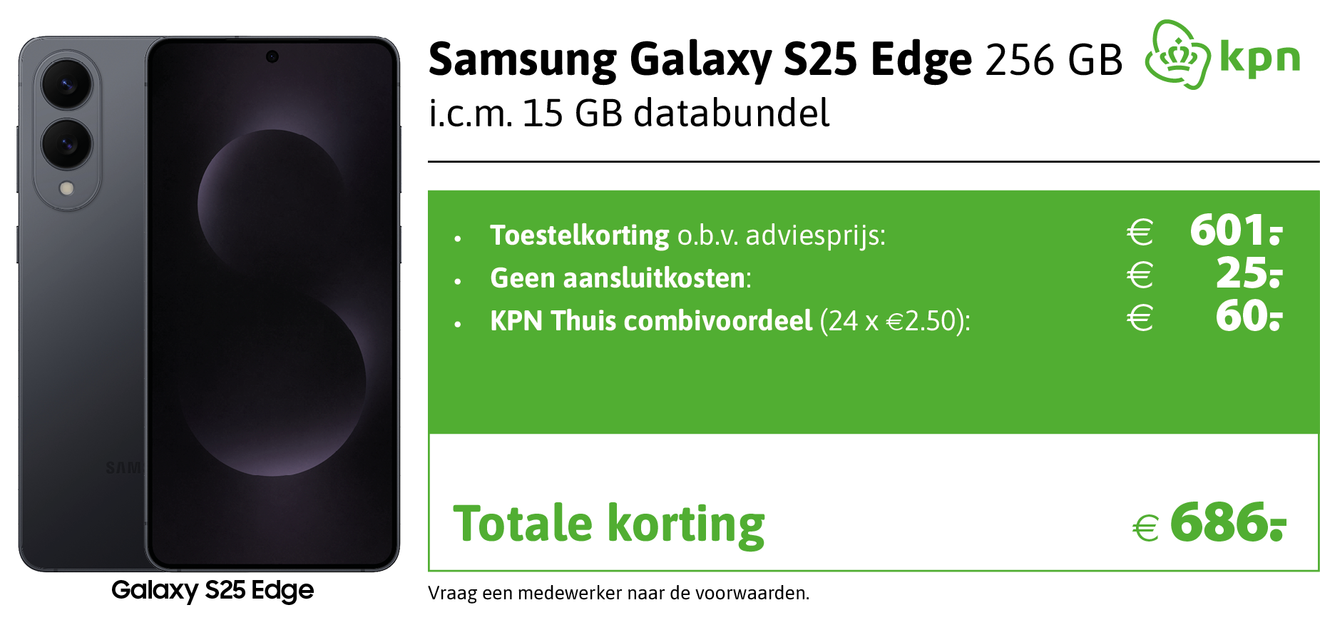 Grijp nu je kans op tijdelijke aanbiedingen. Kies bijvoorbeeld voor de Samsung Galaxy S25 Edge en ontvang €686 korting. Meer fan van Sim Only? Je hebt al een Unlimited Sim Only abonnement bij KPN vanaf €22,50 per maand inclusief klantvoordeel.