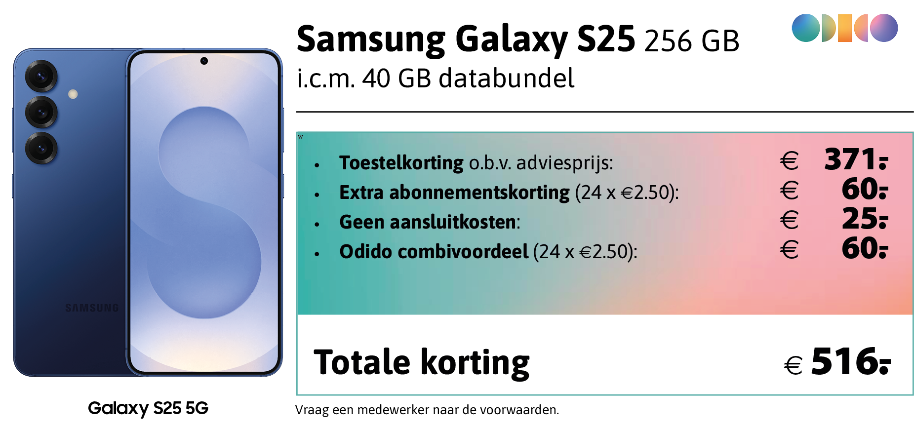De Samsung Galaxy S25 is krachtig en betaalbaar. Nu met een korting tot €516 als je deze combineert met een Odido abonnement!