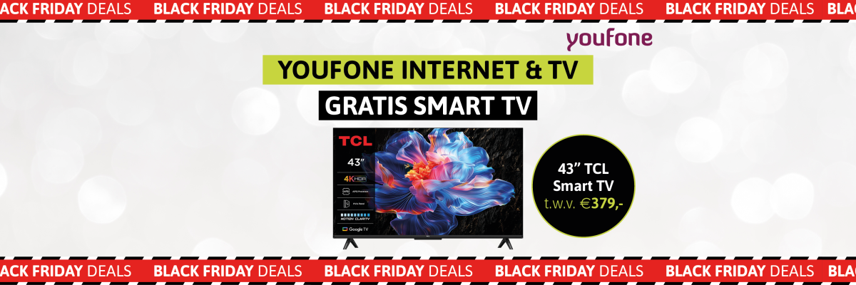 Bij Welcom is Black Friday alvast van start! Sluit nu een nieuw Youfone Internet & TV abonnement af en profiteer van een exclusief voordeel. Je ontvangt óf een gratis 43” TCL Smart TV ter waarde van €379, óf je kiest voor een flinke korting die kan oplopen tot wel 16 maanden op je abonnement.